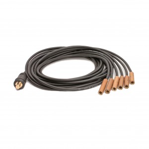 We manufacture 2 ways splitters cables up to 6 ways splitter cables from 10mm² copper cable (welding cable) in one metre lengths as standard. The cable has a 300 Amp male Dinse or Camlock (optional) connector on one end for connection to the heat treatment unit and two or more 60 Amp female Camlock connectors on the other end used for connection to the ceramic heaters.